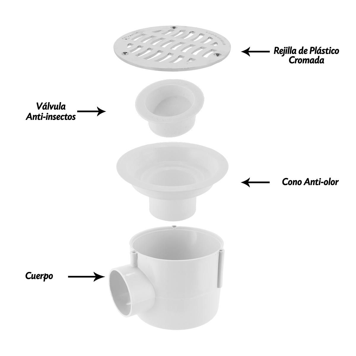 • Contenido: Cuerpo, cono anti-olor, válvula anti-insectos, rejilla de plástico cromada.