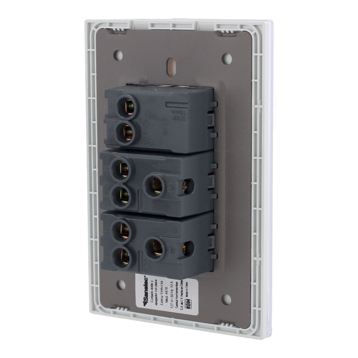 Placa con 1 apagador y 2 contactos línea Venecia 4478 Sanelec