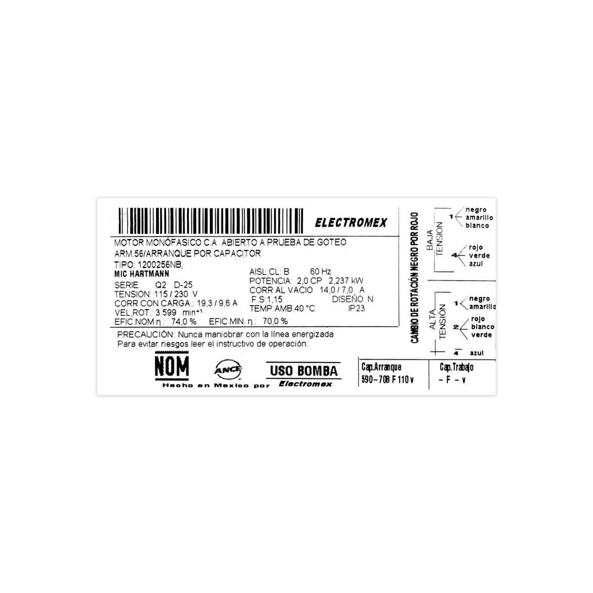 El voltaje de este motor es de 115 / 230V - 60 Hz.