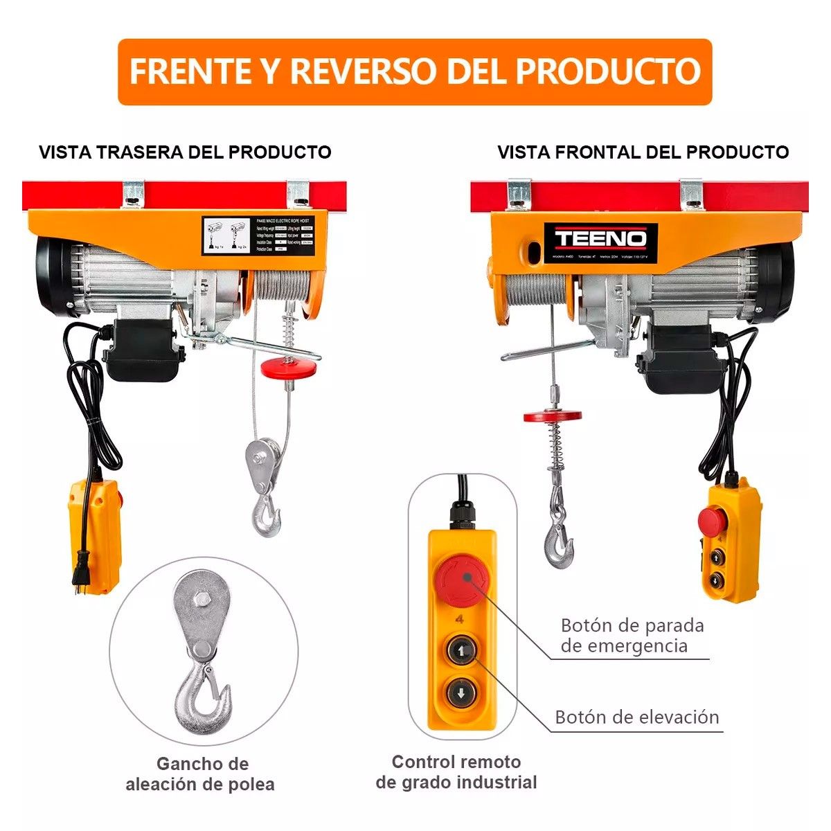 • Contiene control remoto de grado industrial con botón de elevación y freno de emergencia.