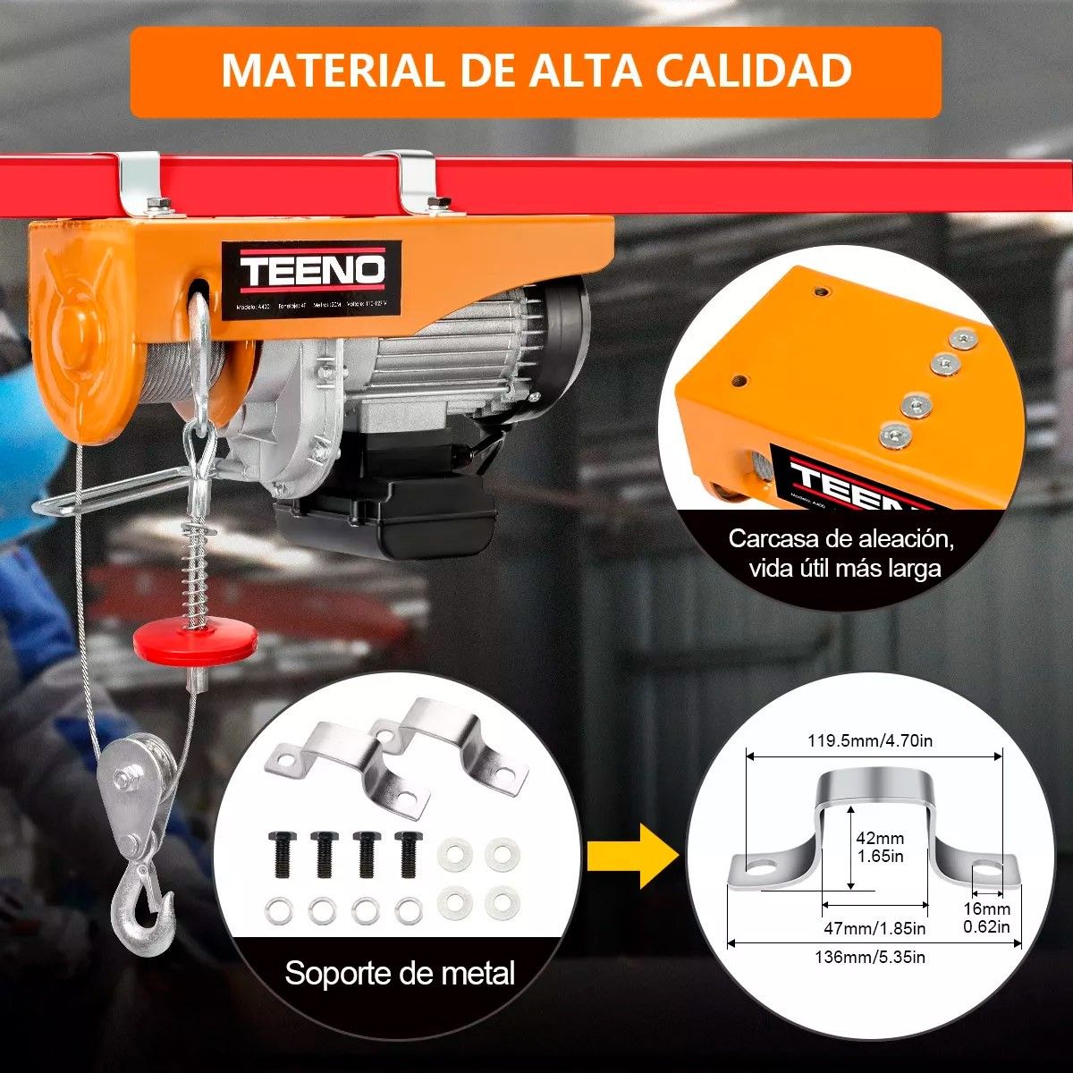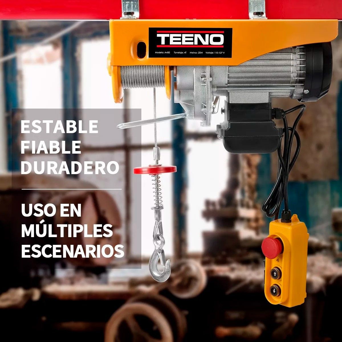 • Puede levantar cargas de hasta 400 kg con el gancho de elevación y el gancho de polea incluido a doble línea de cable.