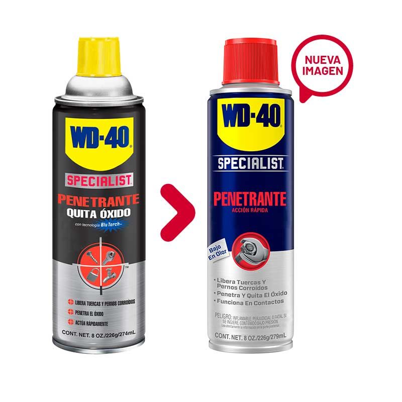 • El Penetrante de Acción Rápida WD-40® Specialist® libera de manera rápida y eficaz piezas y mecanismos, incluso los fuertemente corroídos o atascados por acumulación de óxido. Penetra profundamente en grietas, hilos y costuras para romper los enlaces que mantienen unidas las partes pegadas.