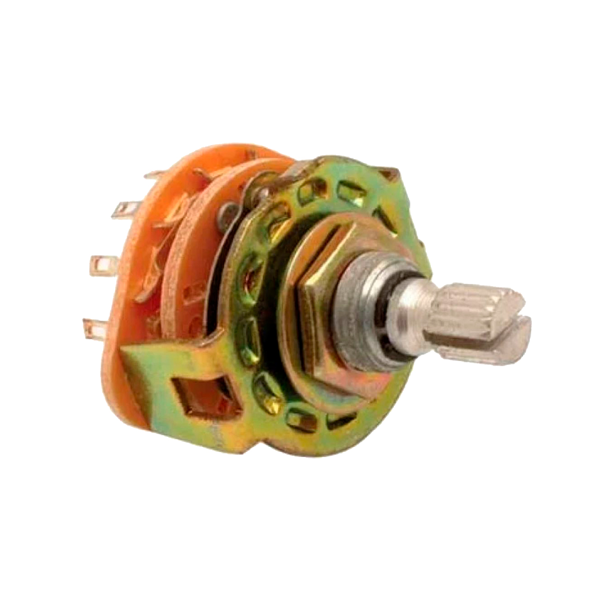 • Interruptor rotatorio (Switch) de 2 polos, 5 tiros, 125 Vca, 350 mA y caña estriada de 1,3 cm.