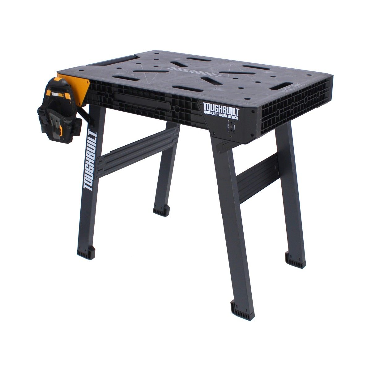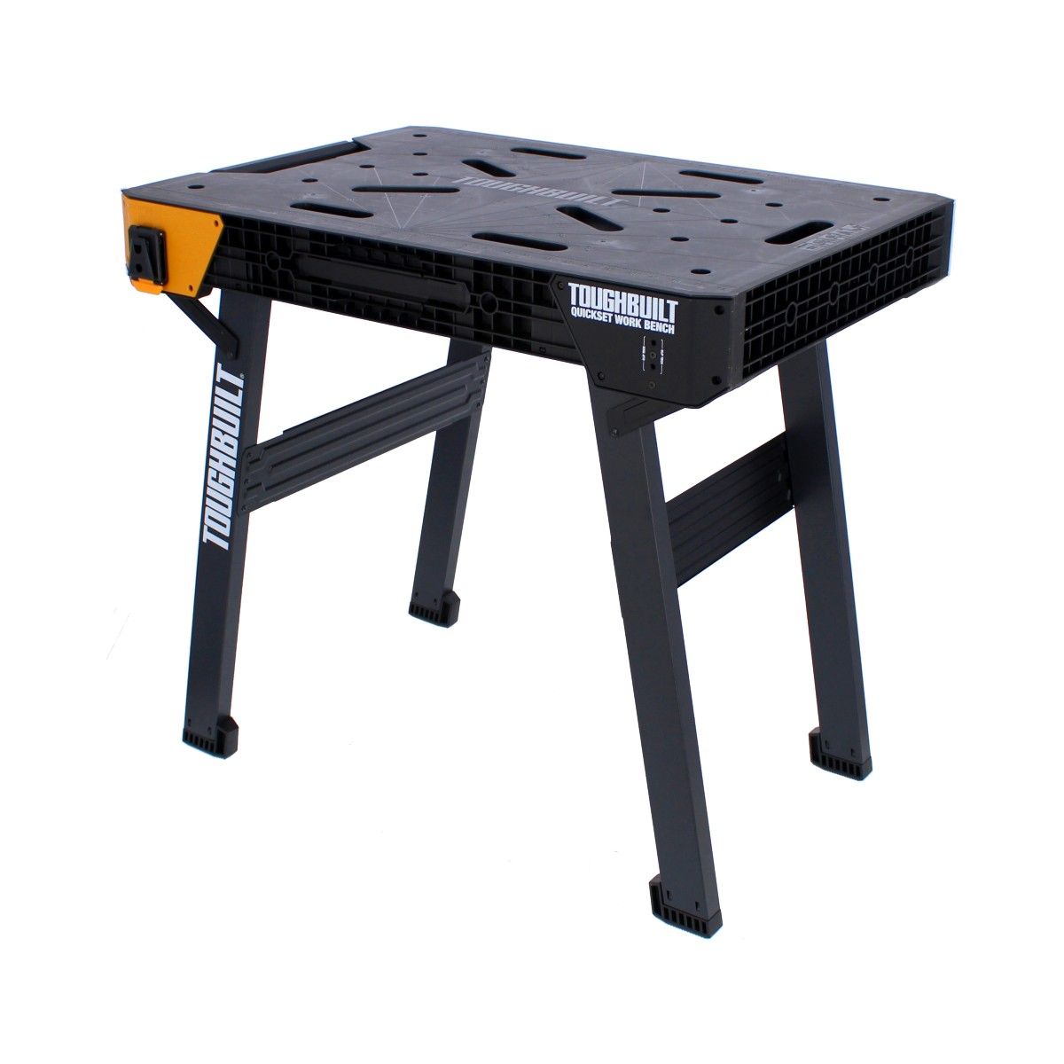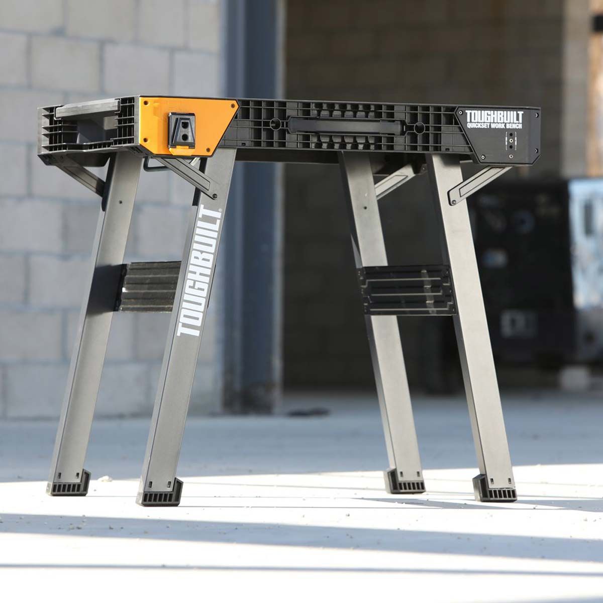 El banco de trabajo ToughBuilt QuickSet es una superficie de trabajo resistente que se instala en segundos. Simplemente presione el dispositivo de liberación y tire hacia arriba de la manija para plegar las patas y hacer una gran superficie de trabajo en cualquier lugar.