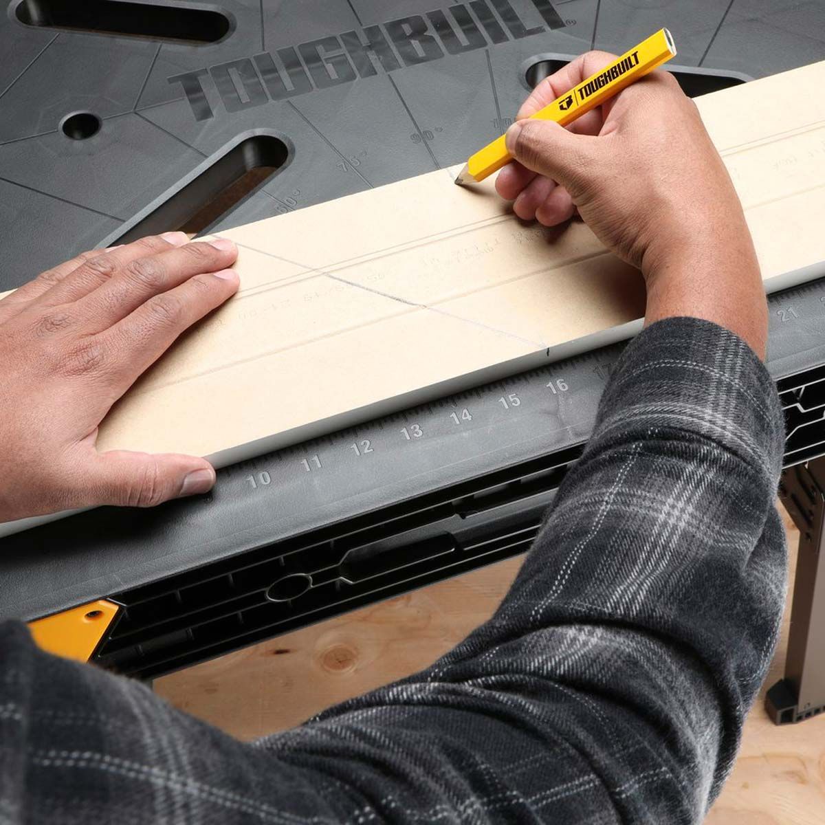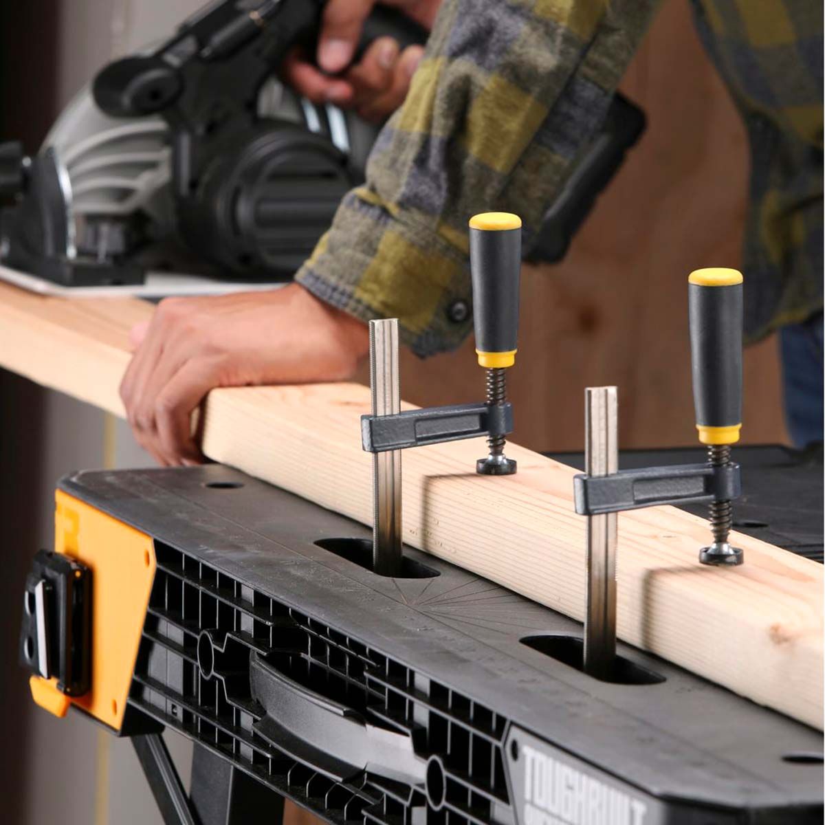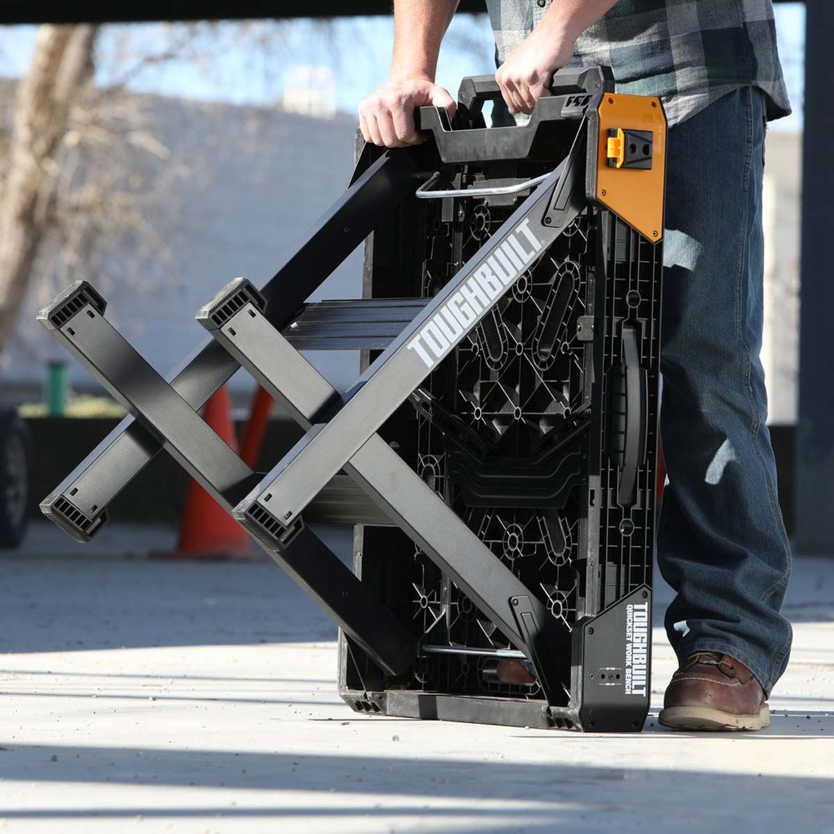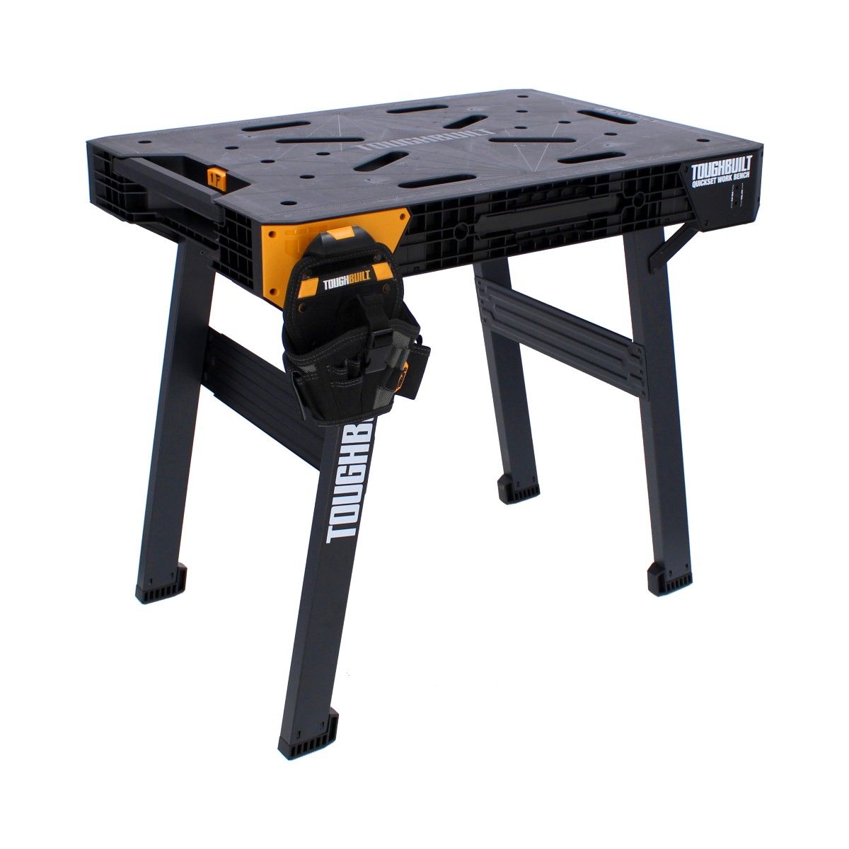 El banco de trabajo ToughBuilt QuickSet es una superficie de trabajo resistente que se instala en segundos. Simplemente presione el dispositivo de liberación y tire hacia arriba de la manija para plegar las patas y hacer una gran superficie de trabajo en cualquier lugar.