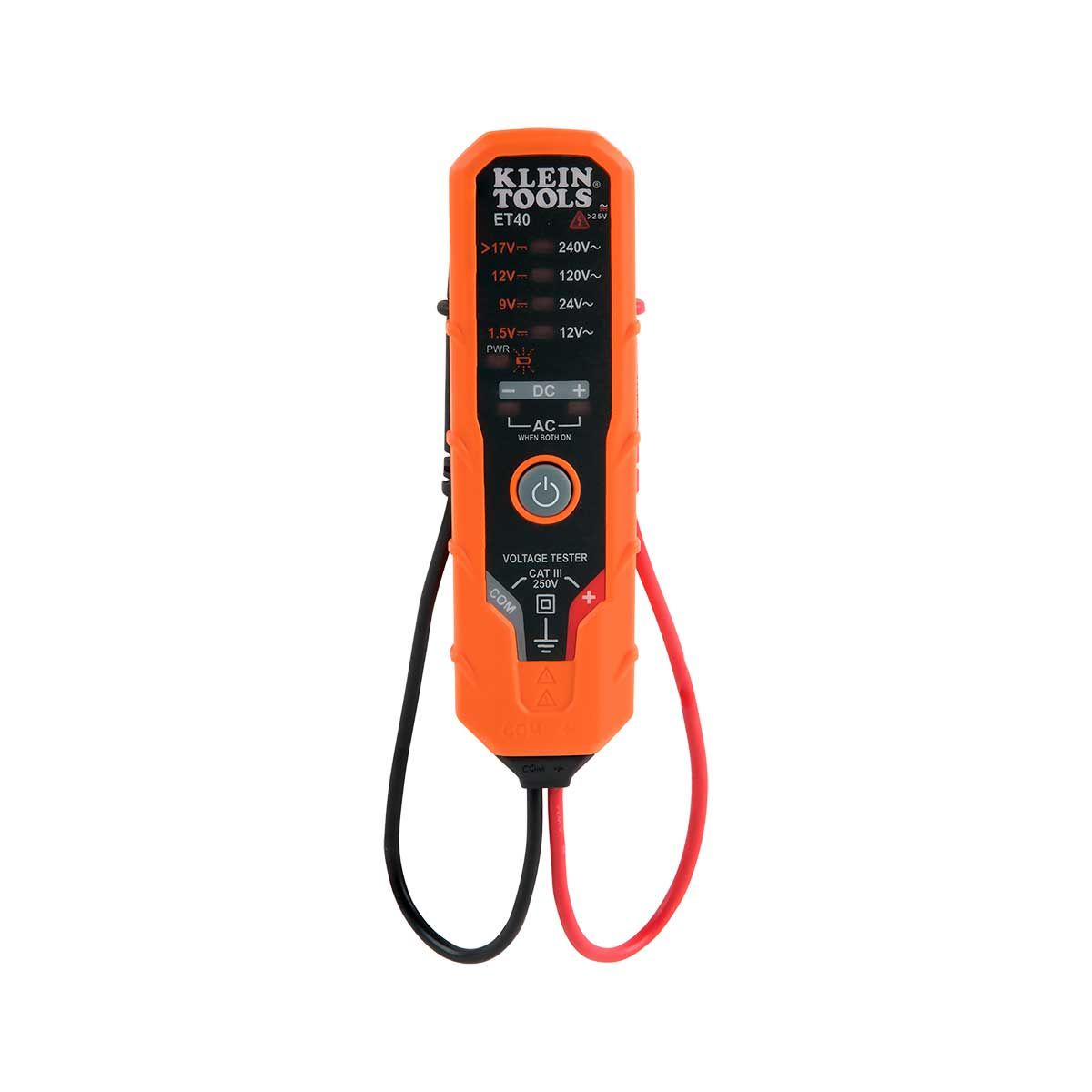 • El probador ET40 prueba voltajes CA de 12 V a 240 V CA en cuatro niveles útiles conforme a los voltajes residenciales más utilizados.