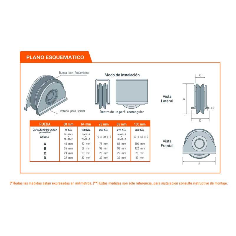 • Posee un rulemán, y placas laterales con pestaña que sirven de apoyo / tope ala base del portón y permiten soldar la rueda de manera alineada.