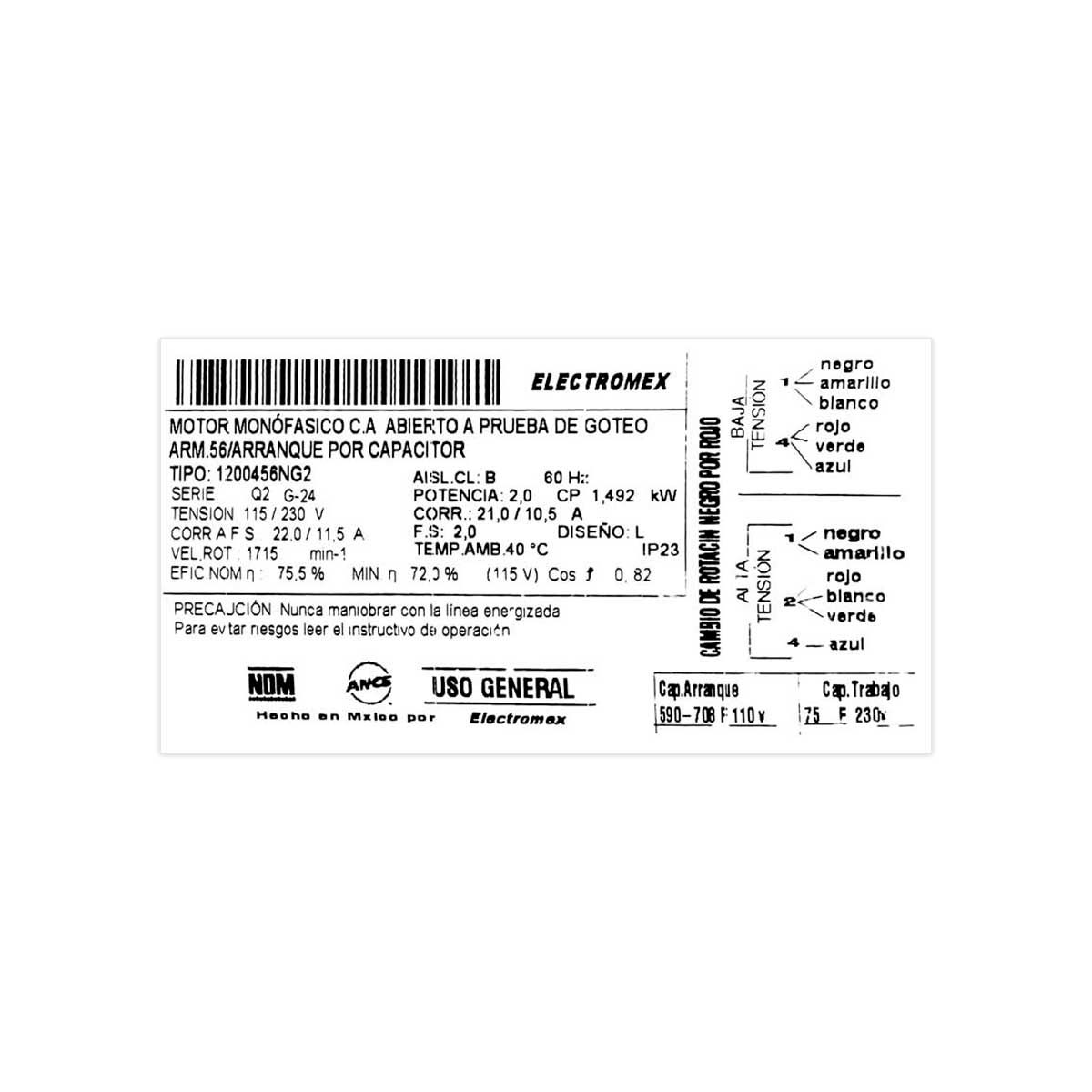 Motor monofásico de 2 HP baja Electromex Siemens