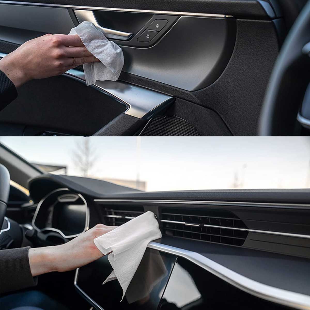 Kit de 12 paños humedecidos para limpieza en todo el interior del automóvil, cada paño mide 30 x 18 cm y vienen envueltos individualmente.