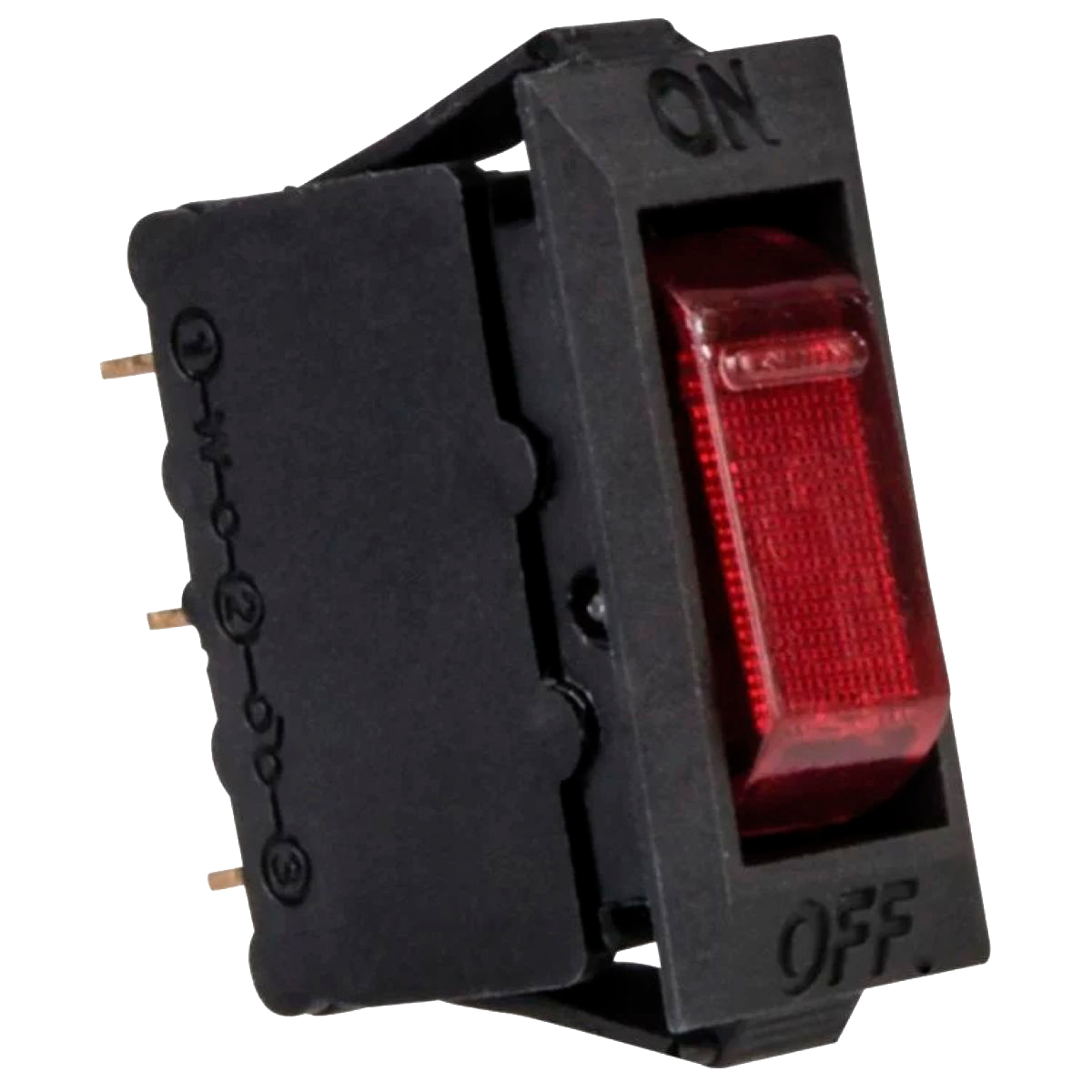 • Interruptor (Switch) de balancín, con foco piloto, de 15 Amperes, 125 Vca, 1 polo, 1 tiro y 2 posiciones (ON-OFF).